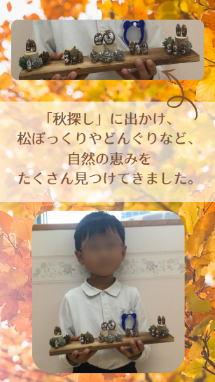 「秋探し」に出かけ、松ぼっくりやどんぐりなど、自然の恵みをたくさん見つけてきました。