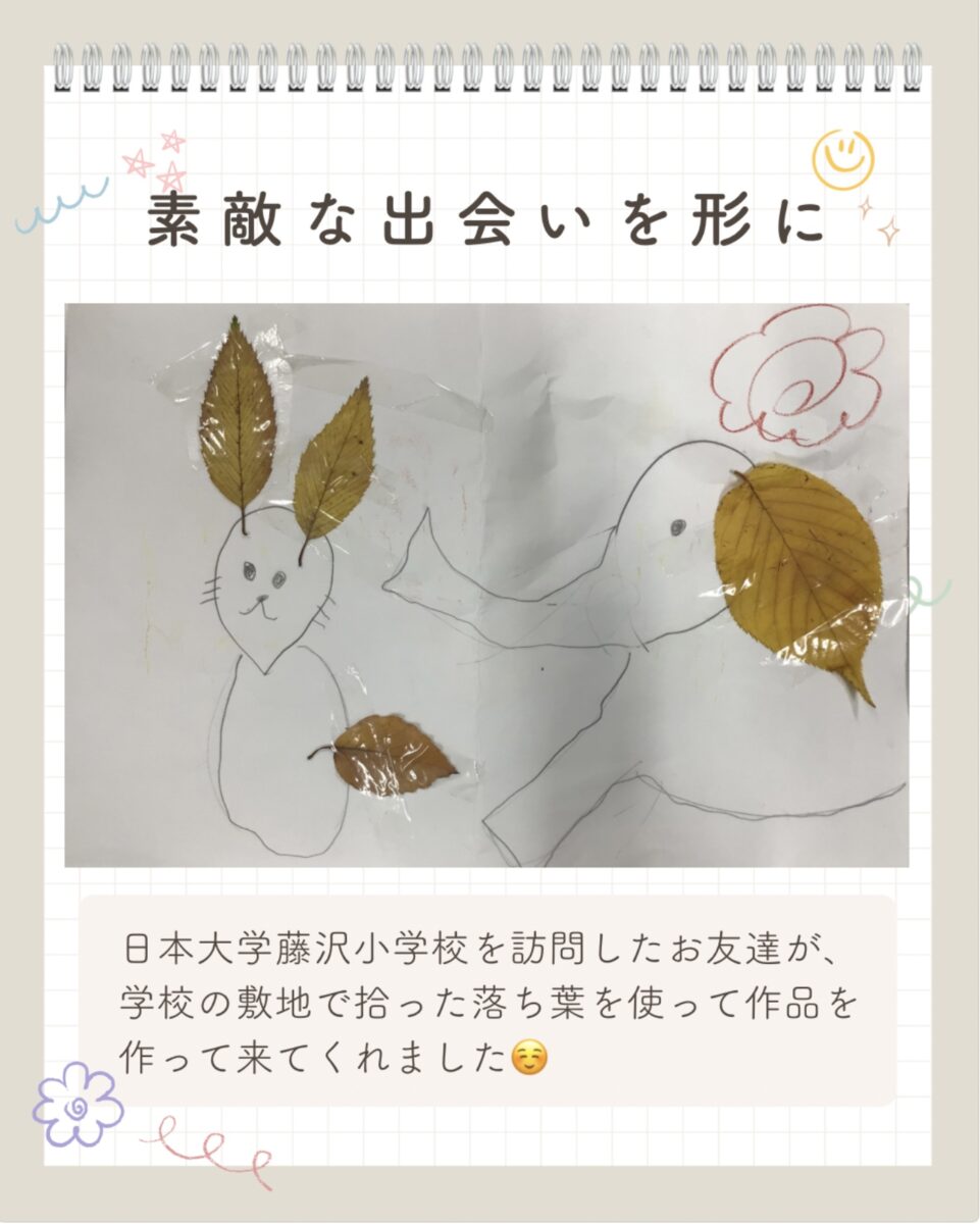 日本大学藤沢小学校を訪問したお友達が、学校の敷地で拾った落ち葉を使って可愛らしい作品を作ってきてくれました。