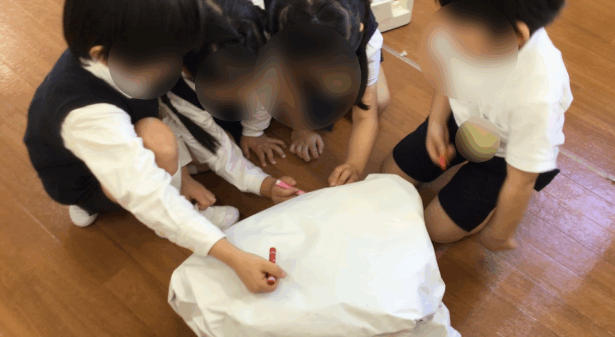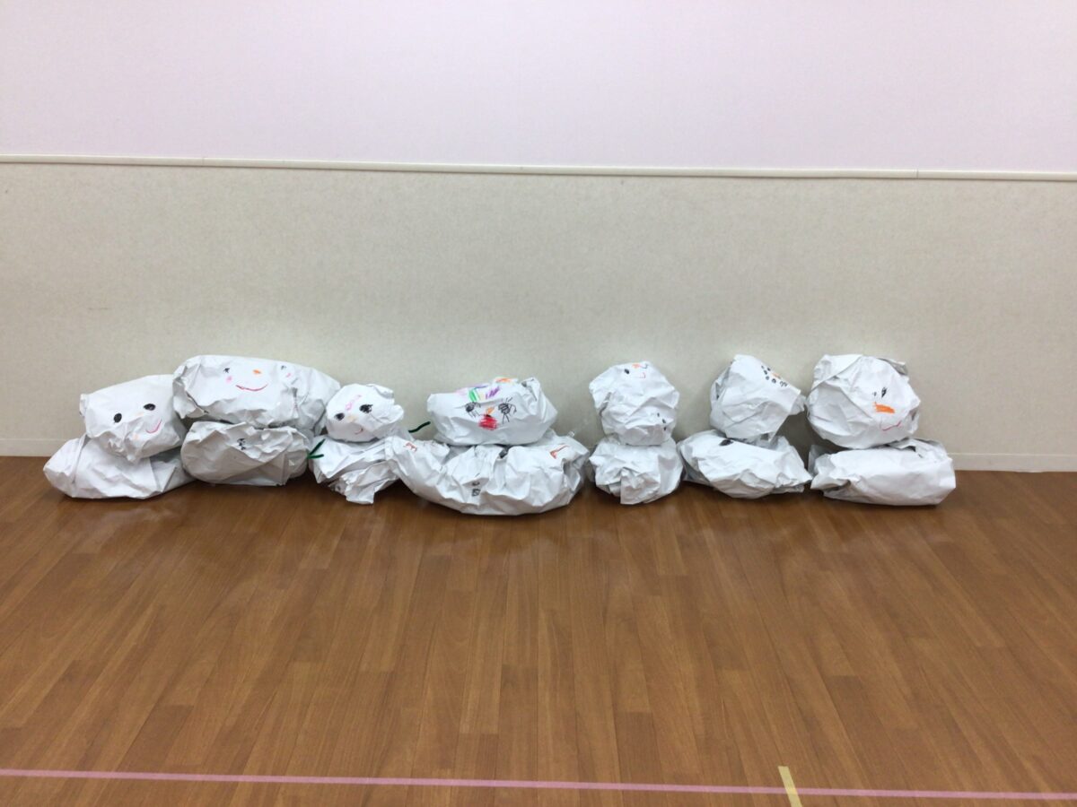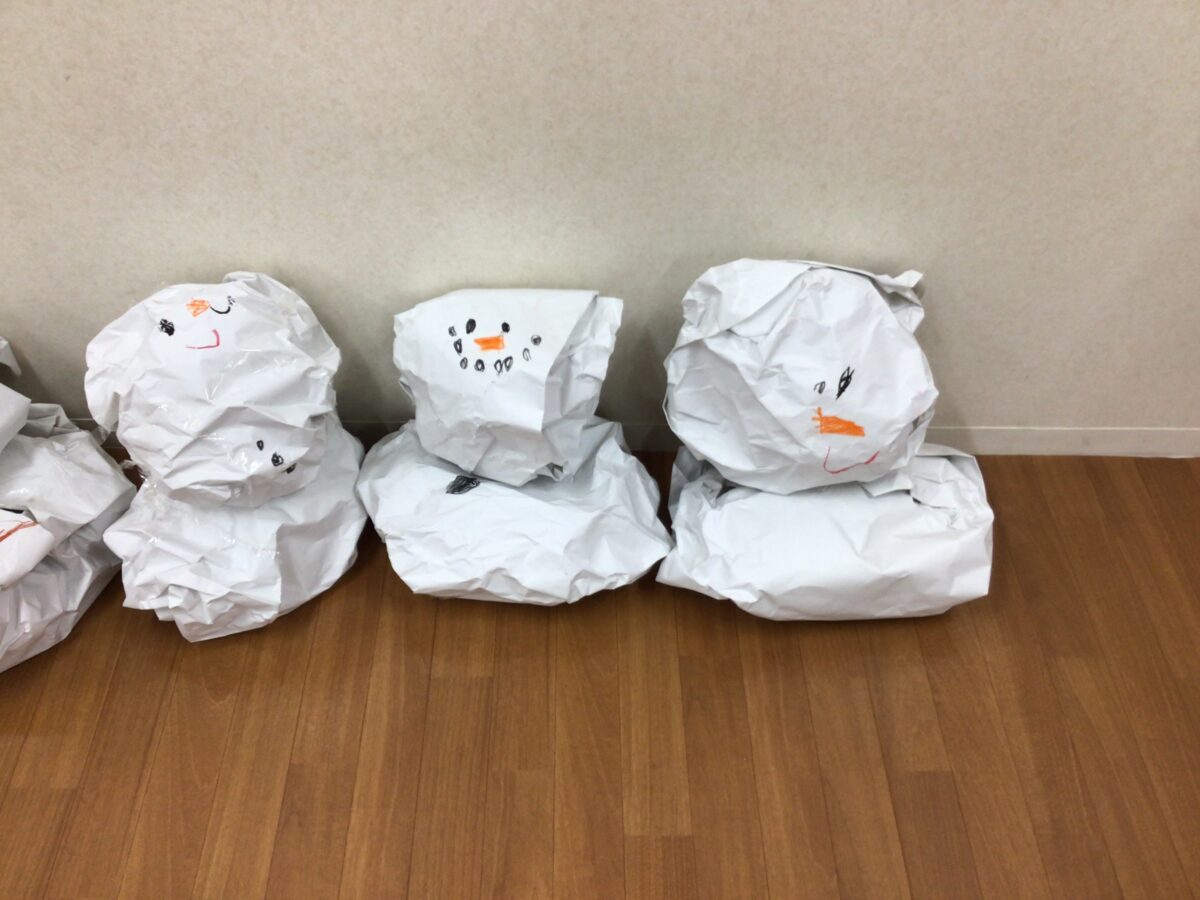 グループごとに、役割分担や手順をお友達と相談して、雪だるまを作りました