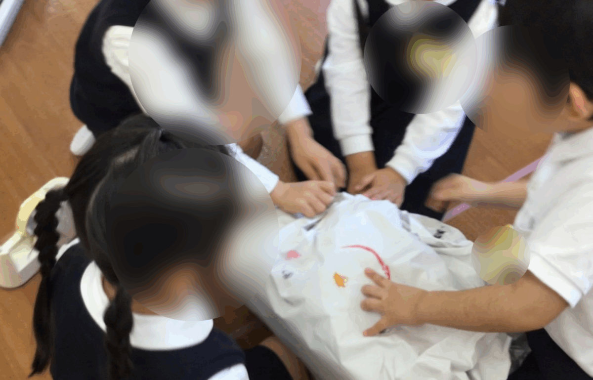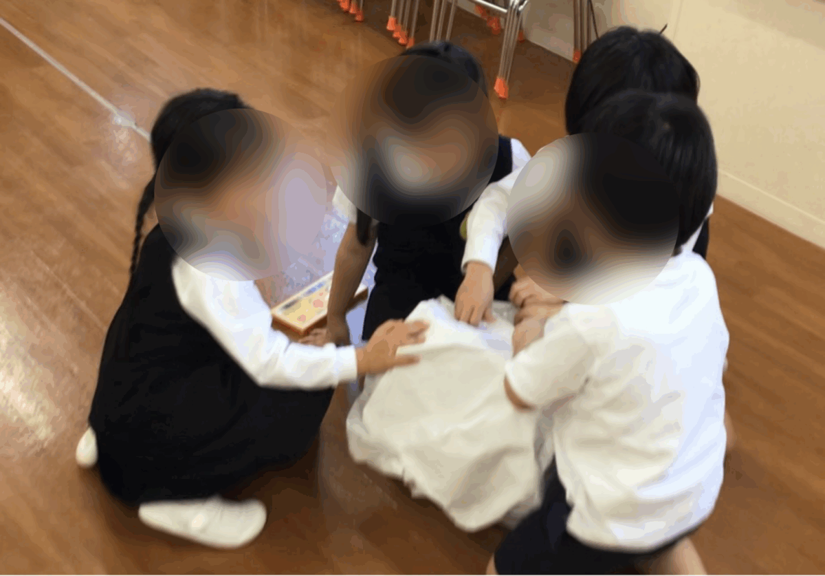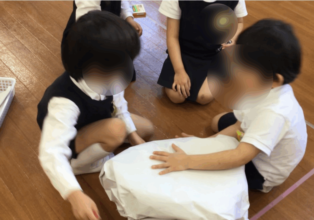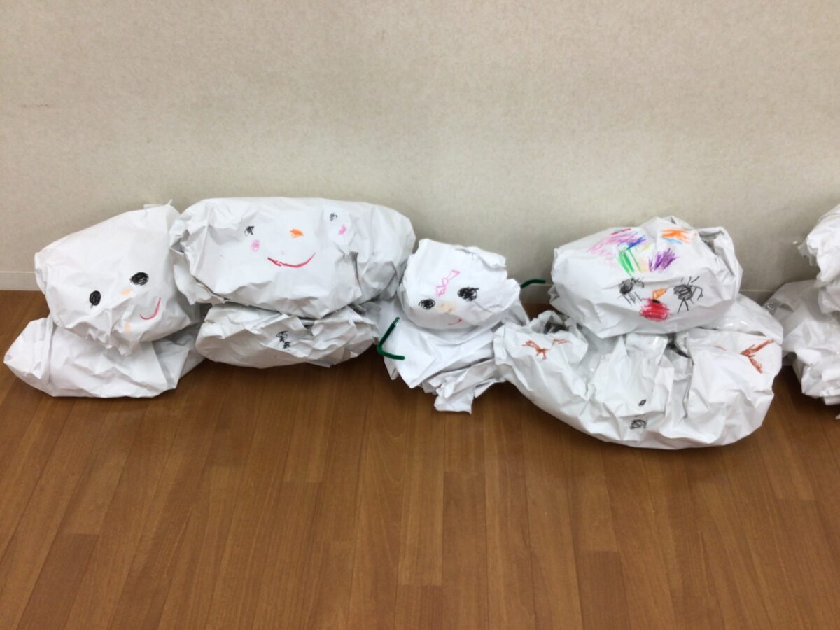 グループごとに、役割分担や手順をお友達と相談して、雪だるまを作りました