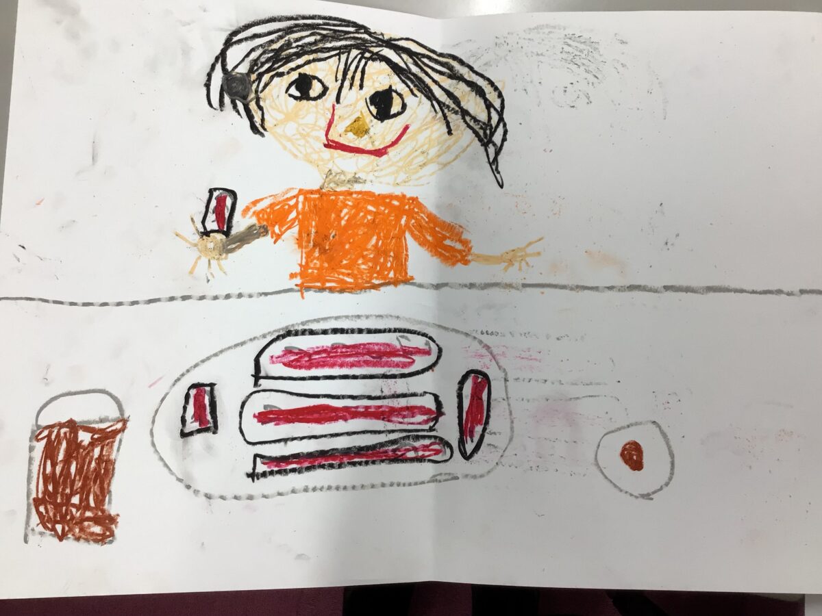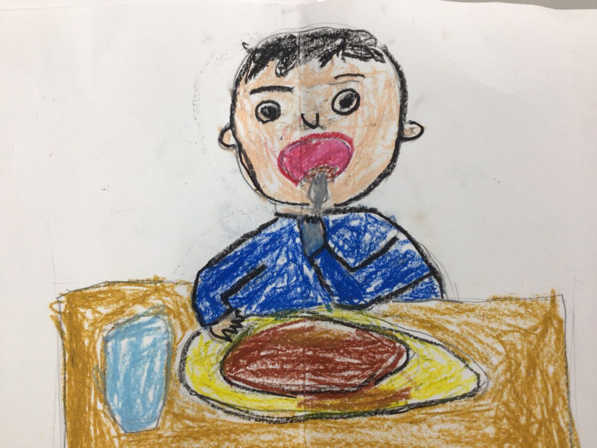 お友達が、おいしいご飯を食べている様子を描いてきてくれました。