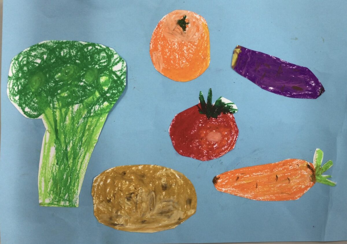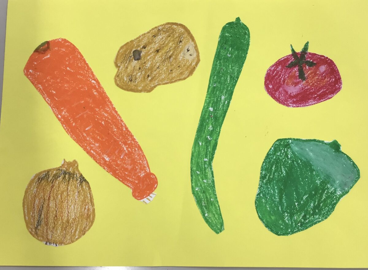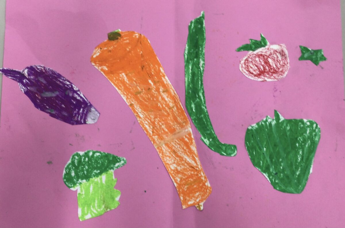 よく観察して、野菜の絵を描き、さらに折り紙などを使って、それを立体にしました。
