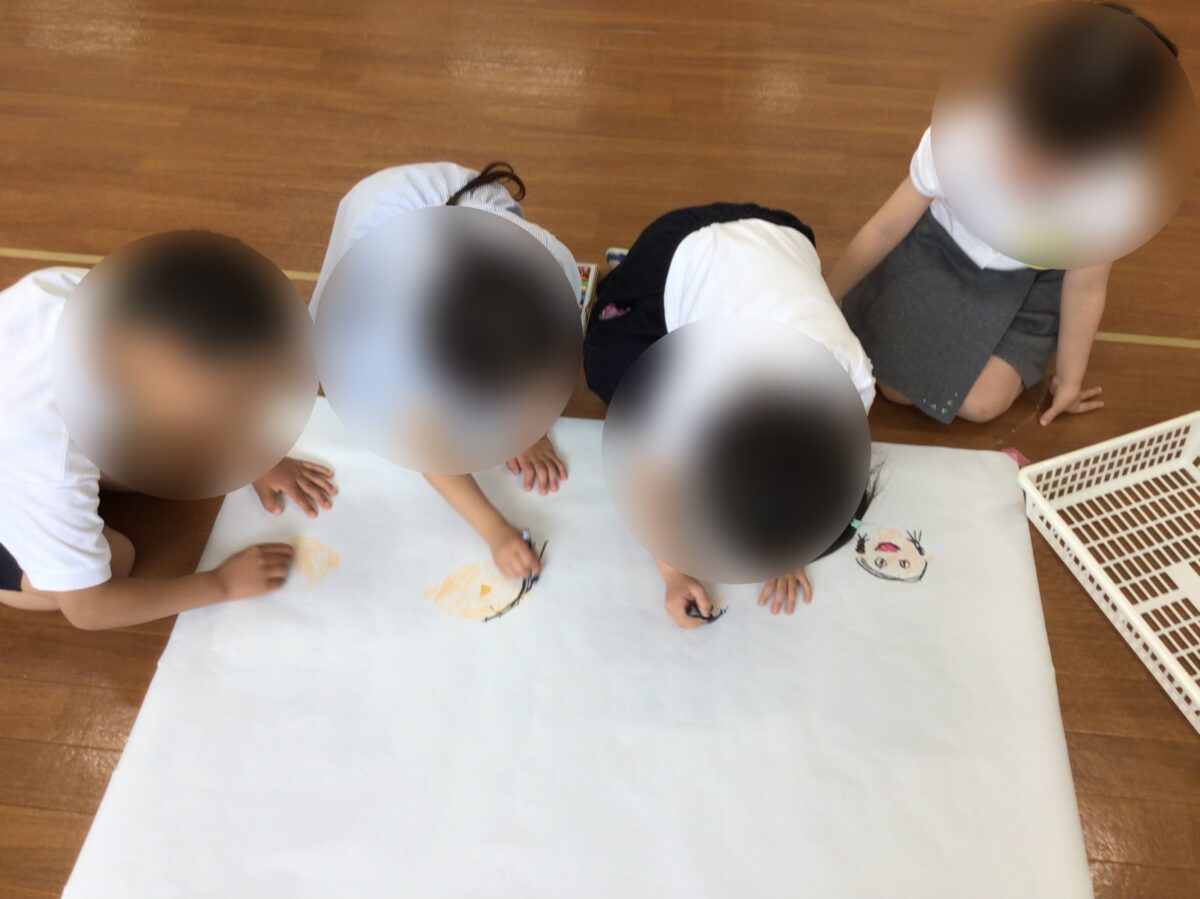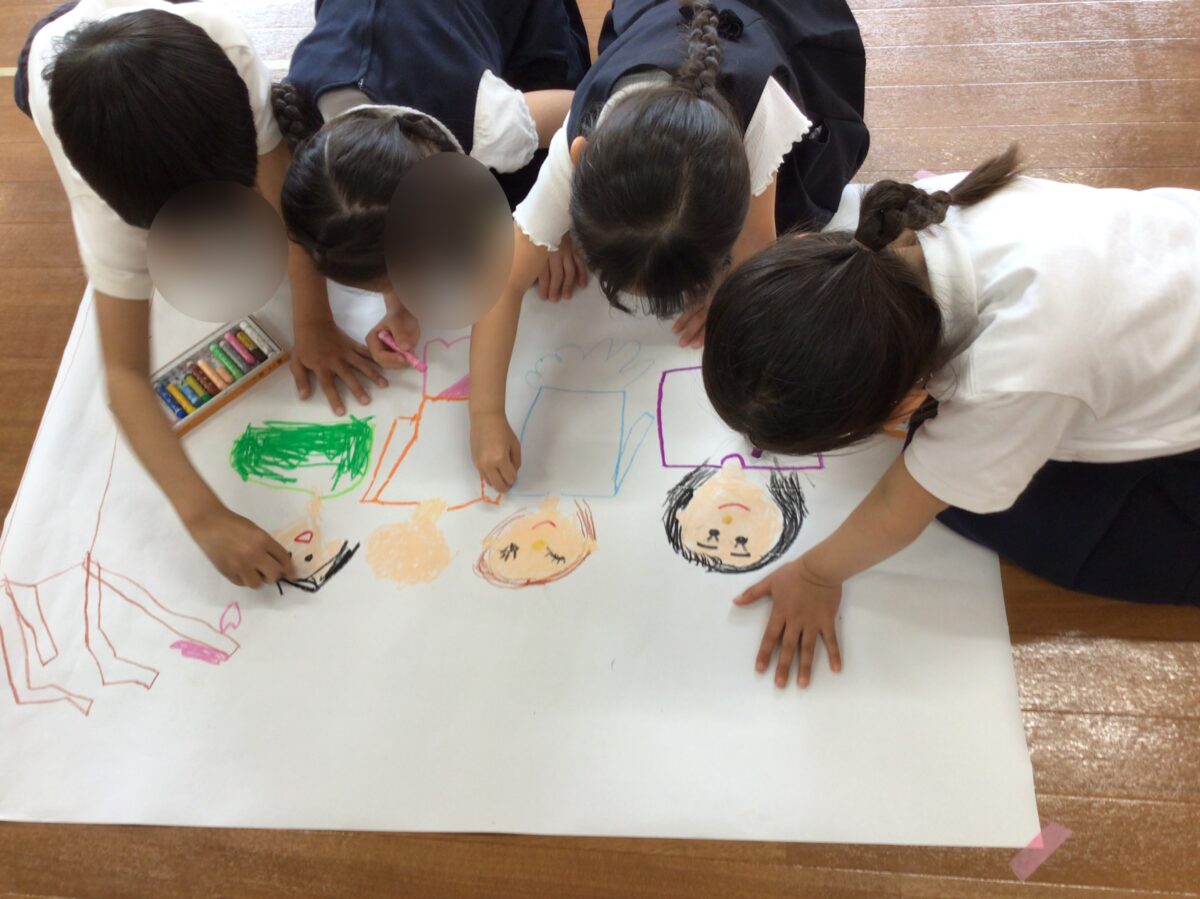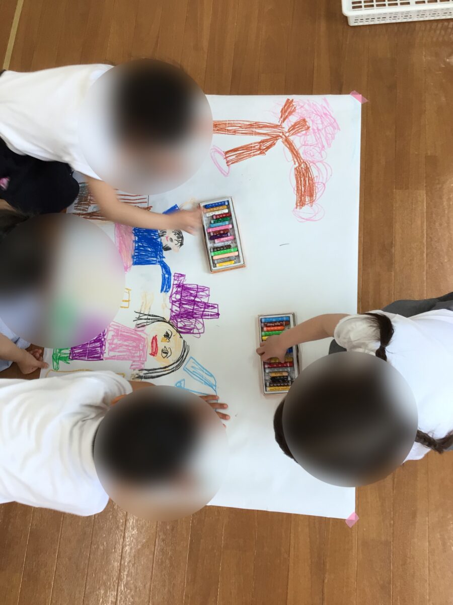 お友達と相談協力して春の絵を描きました。春に関するもの、自分たちが何をしているところかを相談して、役割分担を考え作業を進めました。素敵な絵ができましたね!発表も上手です!