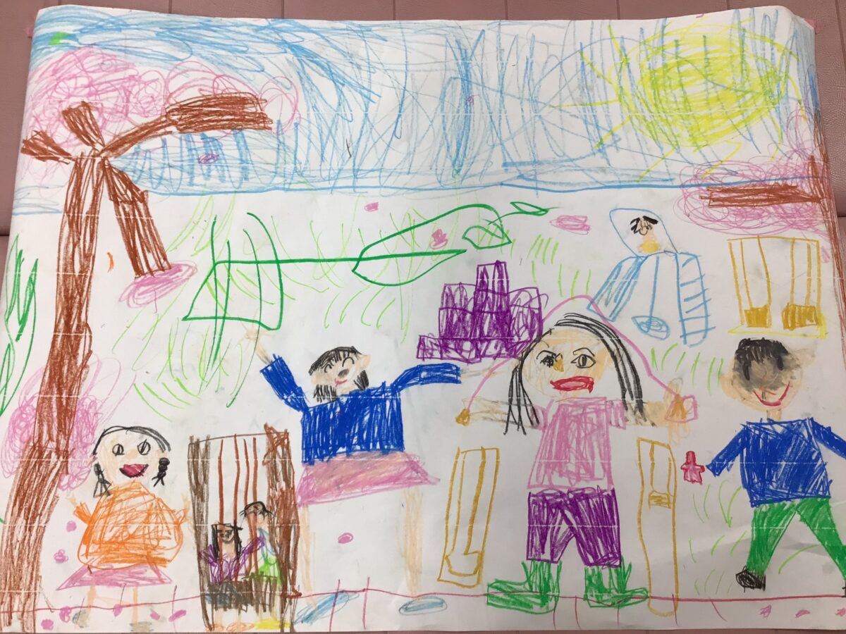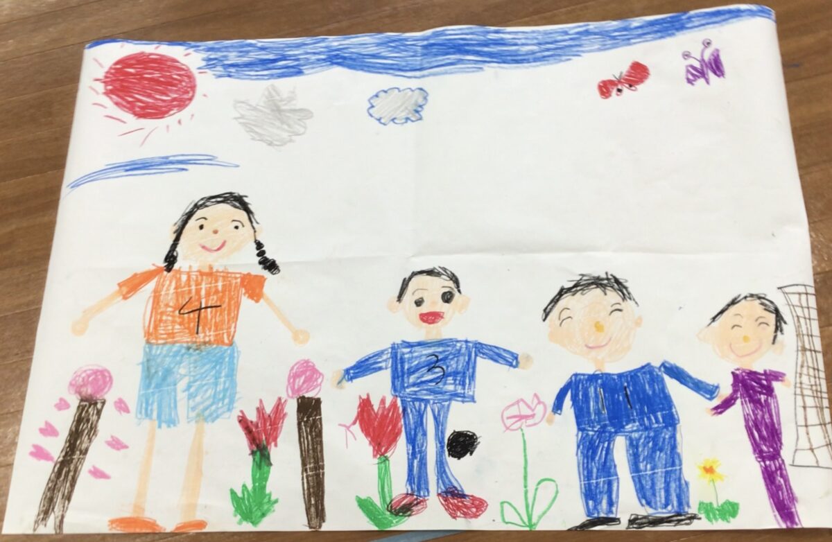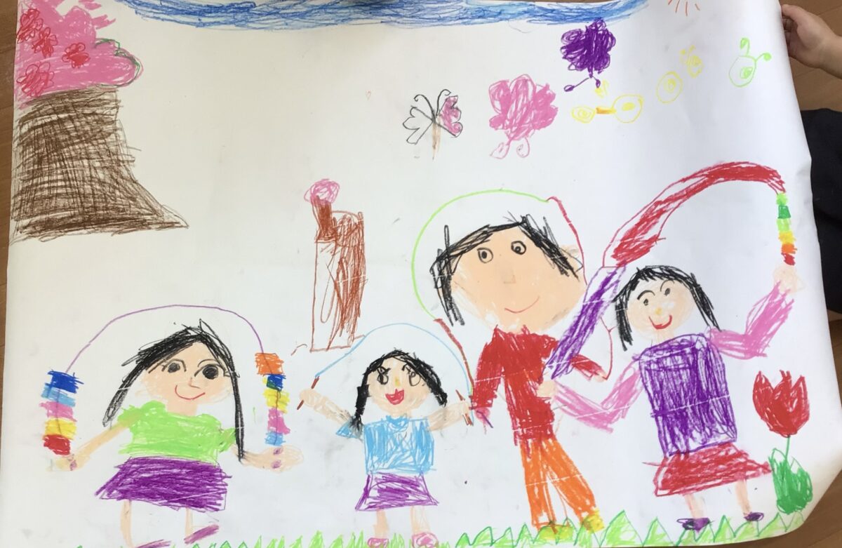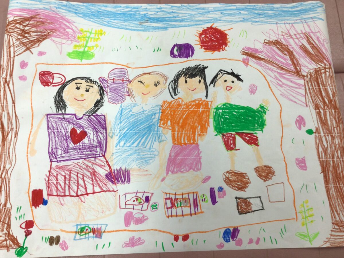 お友達と相談協力して春の絵を描きました。春に関するもの、自分たちが何をしているところかを相談して、役割分担を考え作業を進めました。素敵な絵ができましたね!発表も上手です!
