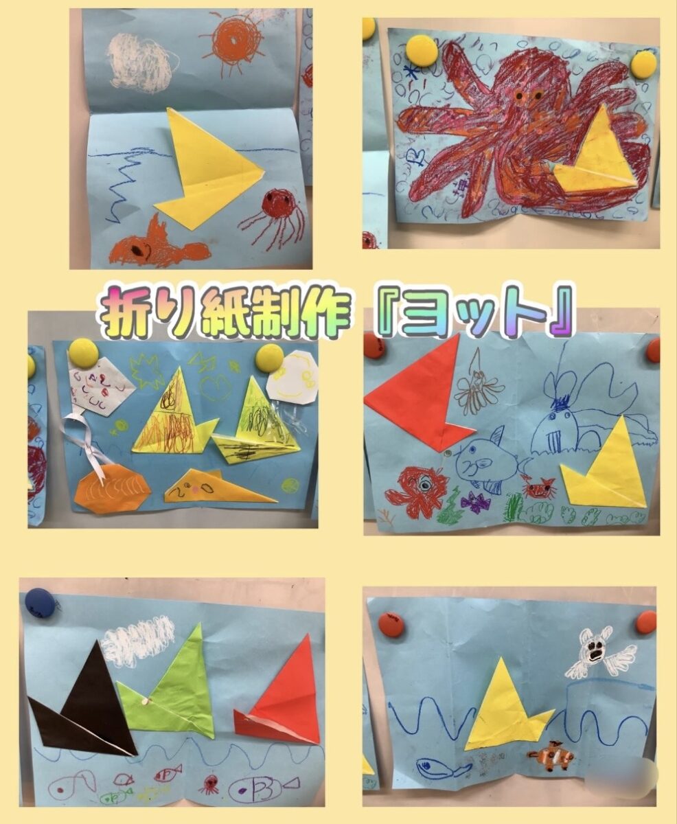 折り紙で作ったヨットを素敵な海の生き物や背景で、絵本の一場面のような素敵な作品に仕上げてくれました!