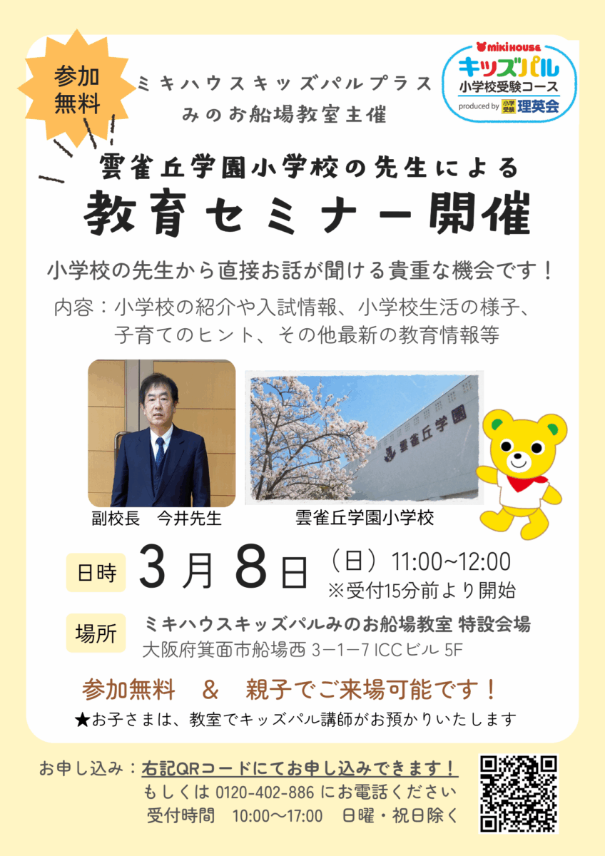 雲雀丘学園小学校の先生による「教育セミナー」実施のお知らせ(3月8日)