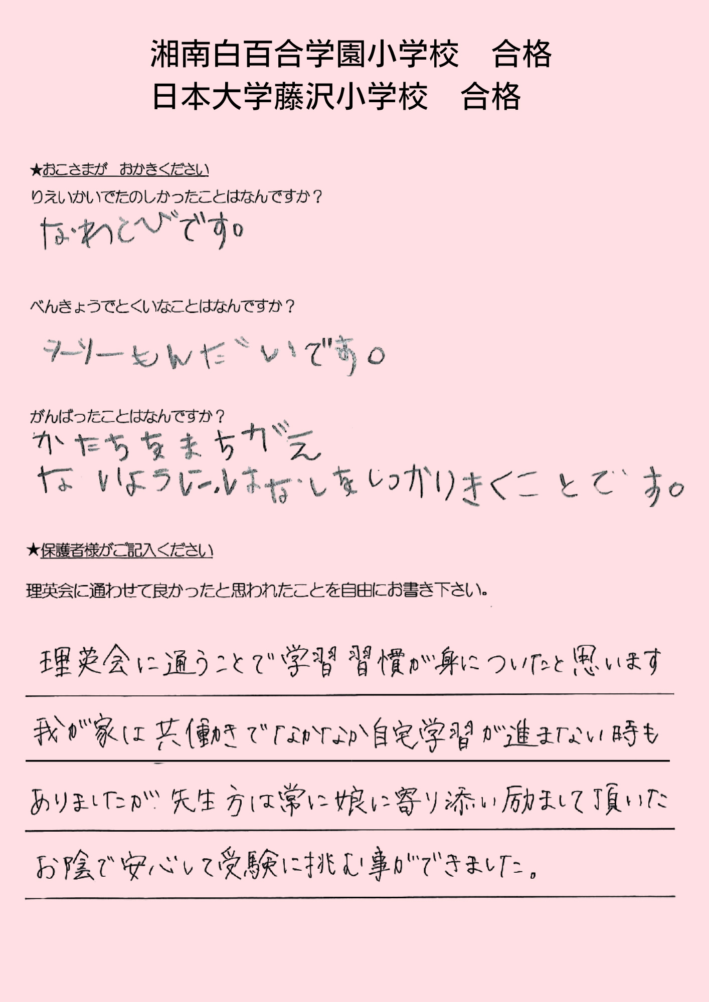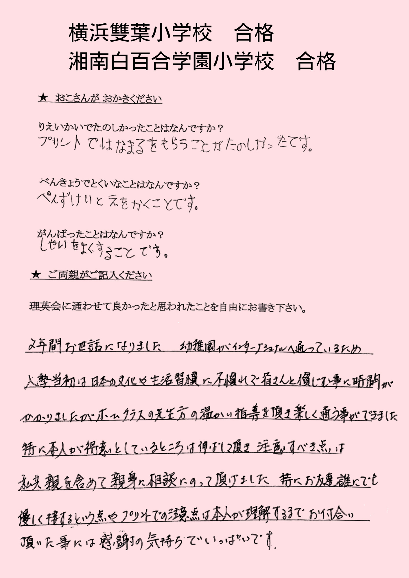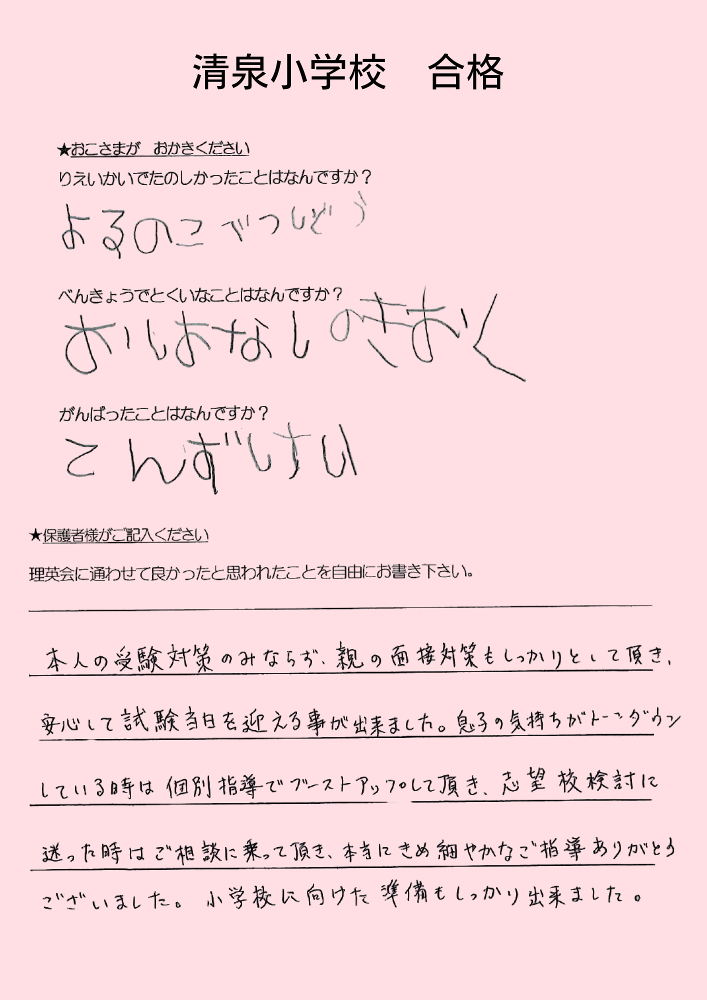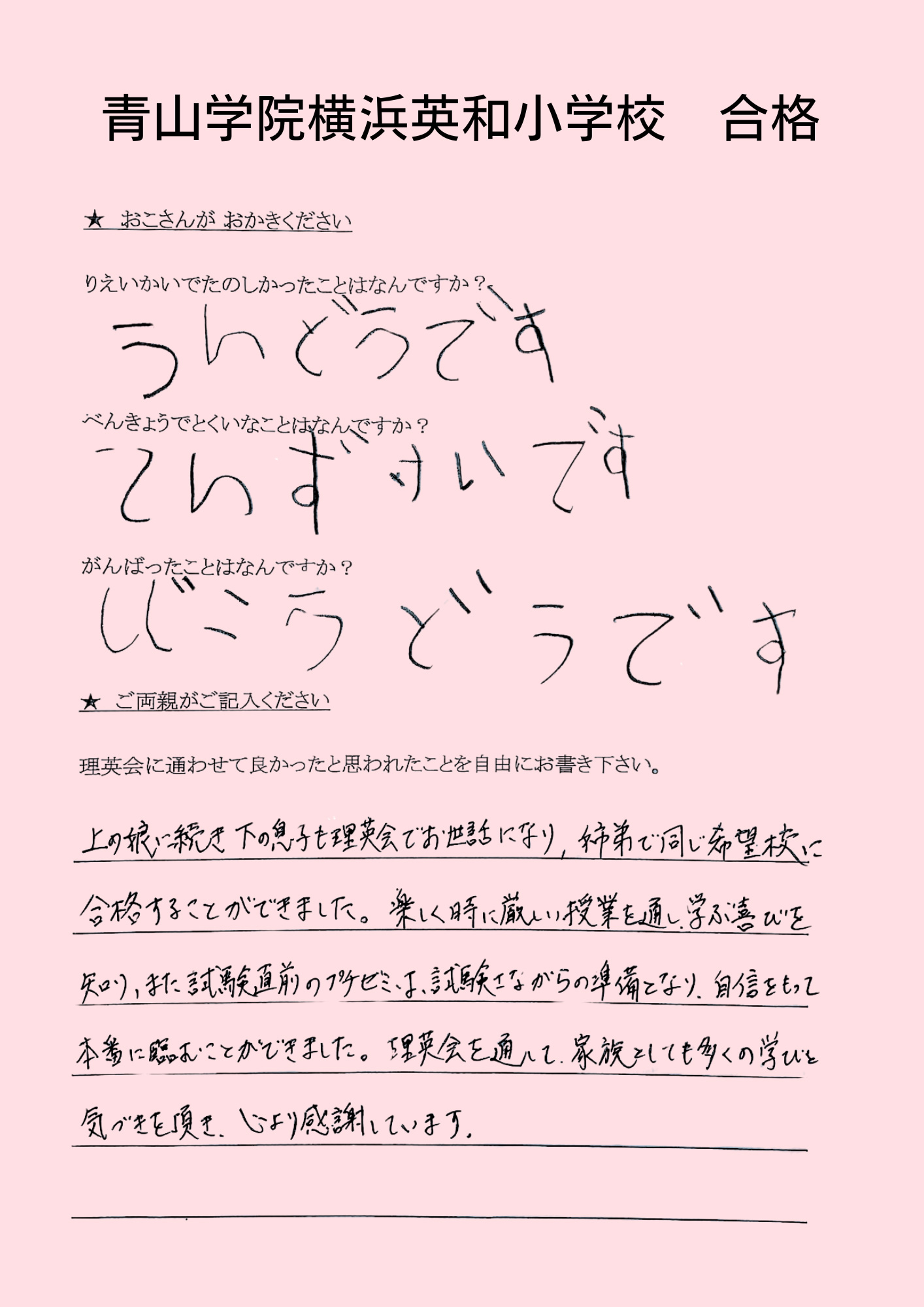 (息子より)合格してホッとした。本当に良かった。頑張ったから、合格出来て嬉しい。 えがえが先生ダイスキ!もう理英会に通えないのが悲しい。もっと理英会の教室に通いたい。 (母より)理英会は程よい緊張感と安心感をどちらも与えてくれる、私達親子にとってなくてはならない場所でした。先生方には本当に沢山の叱咤激励をしていただき、心から感謝申し上げます。理英会に通わせて本当に良かったと思います。有り難うございました。