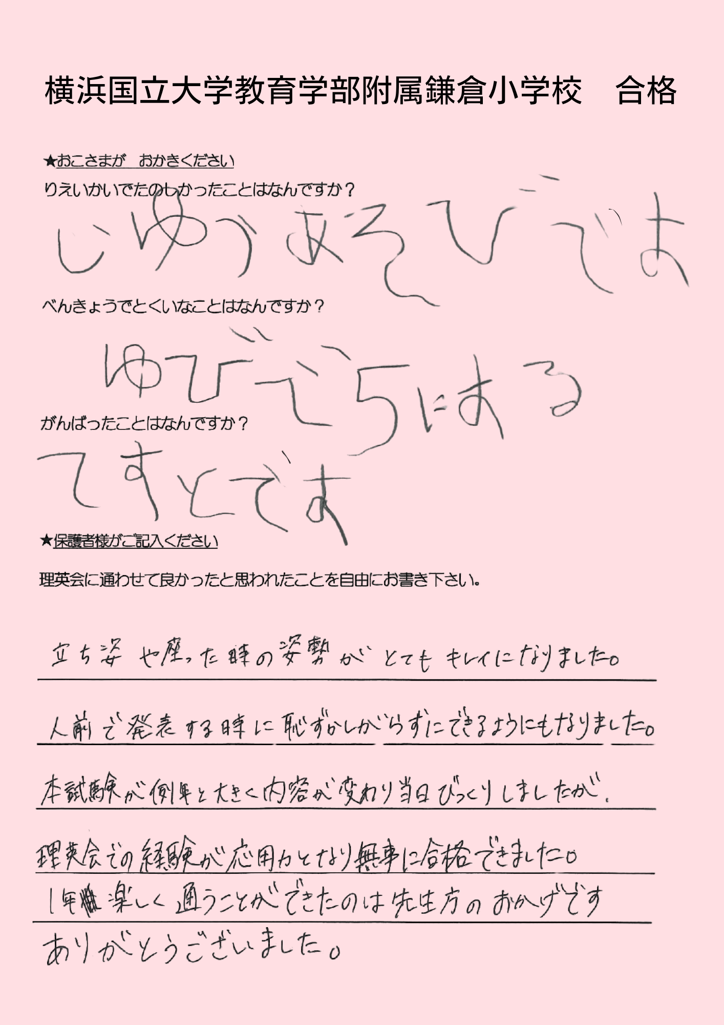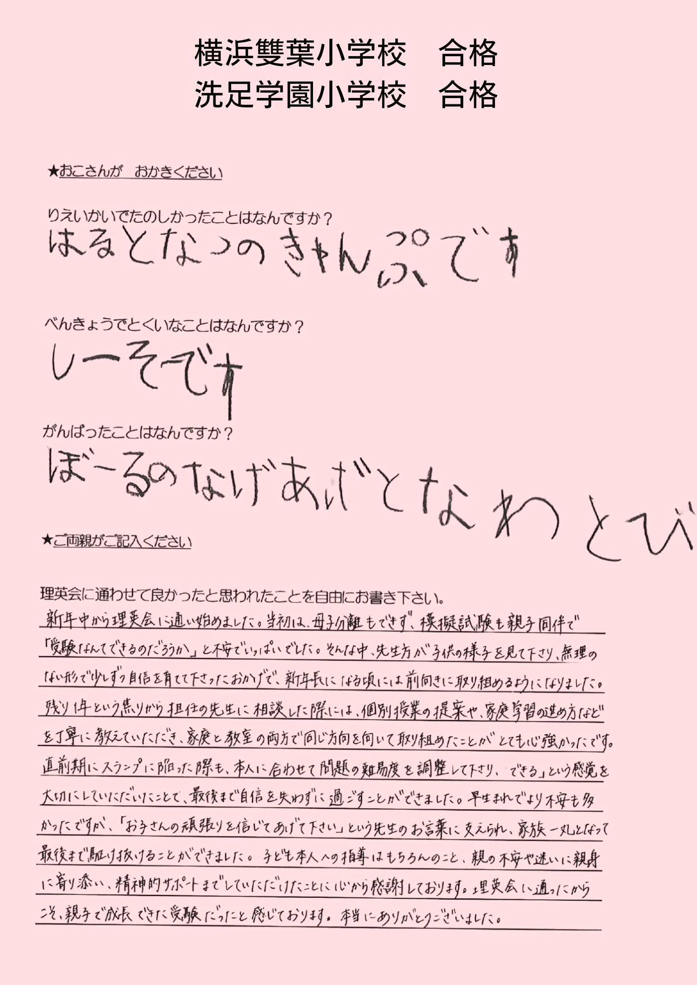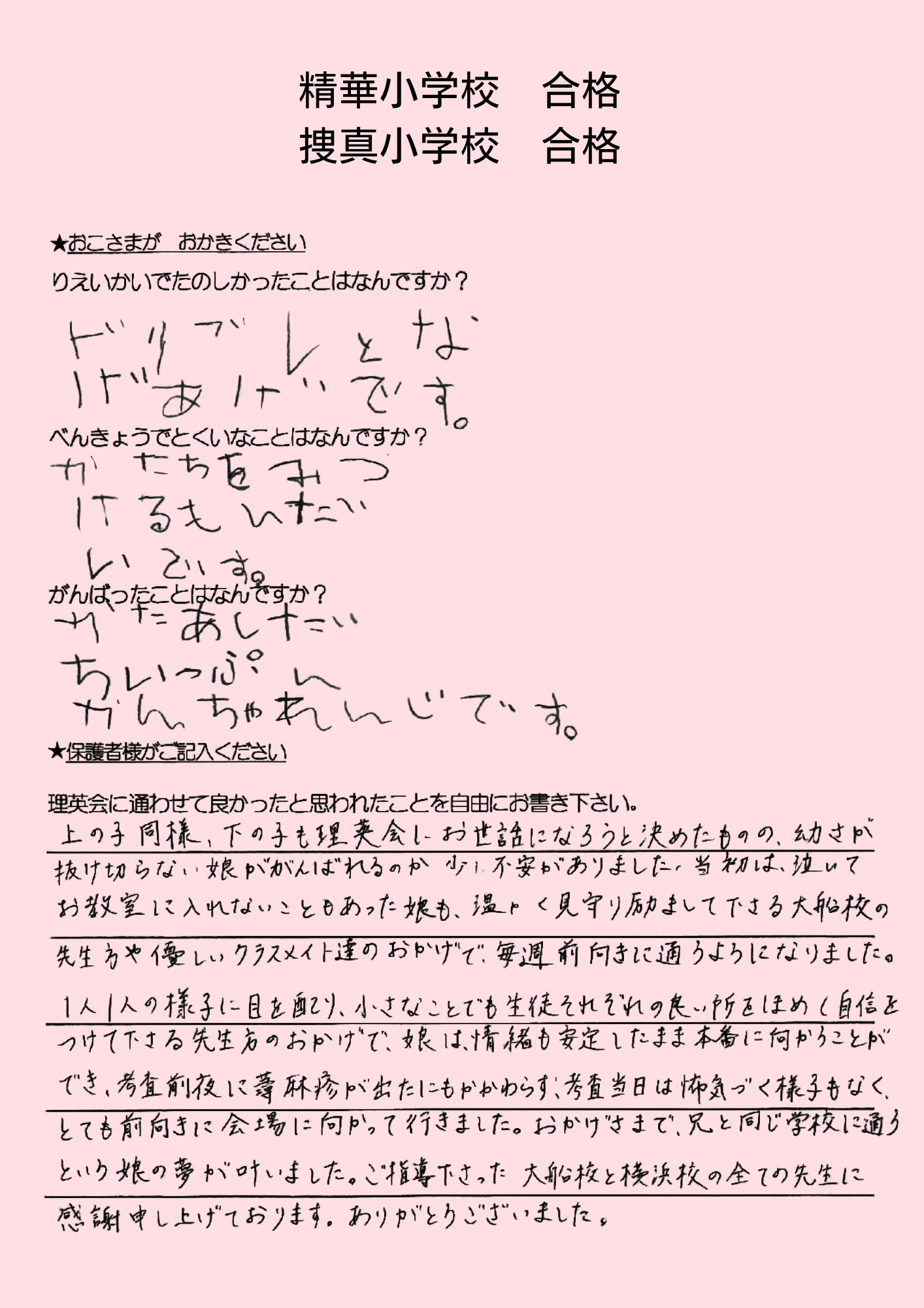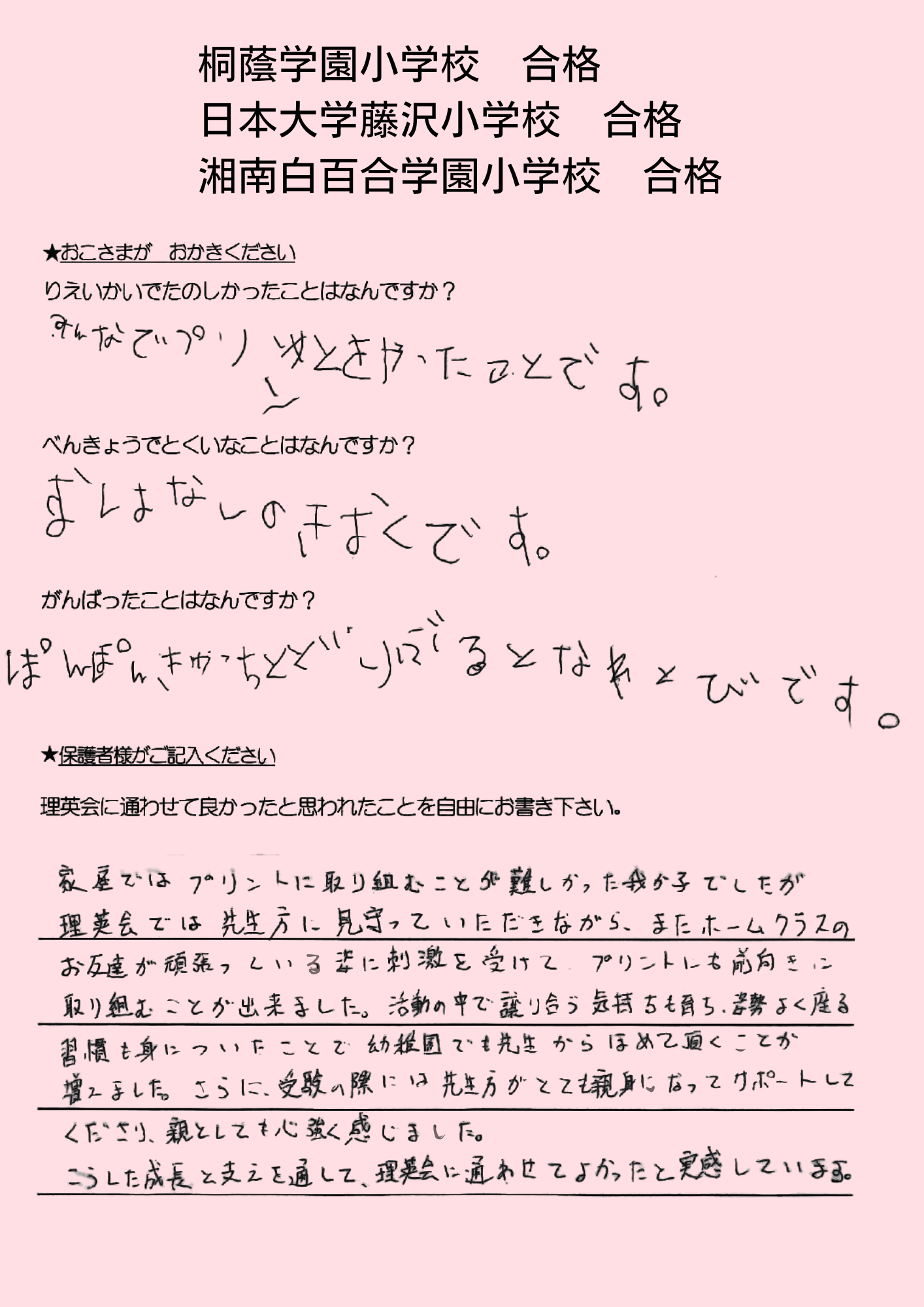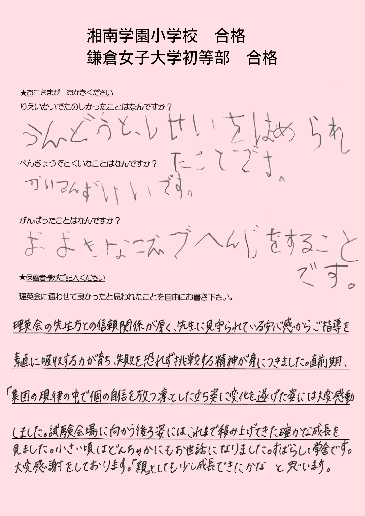 (息子より)合格してホッとした。本当に良かった。頑張ったから、合格出来て嬉しい。 えがえが先生ダイスキ!もう理英会に通えないのが悲しい。もっと理英会の教室に通いたい。 (母より)理英会は程よい緊張感と安心感をどちらも与えてくれる、私達親子にとってなくてはならない場所でした。先生方には本当に沢山の叱咤激励をしていただき、心から感謝申し上げます。理英会に通わせて本当に良かったと思います。有り難うございました。
