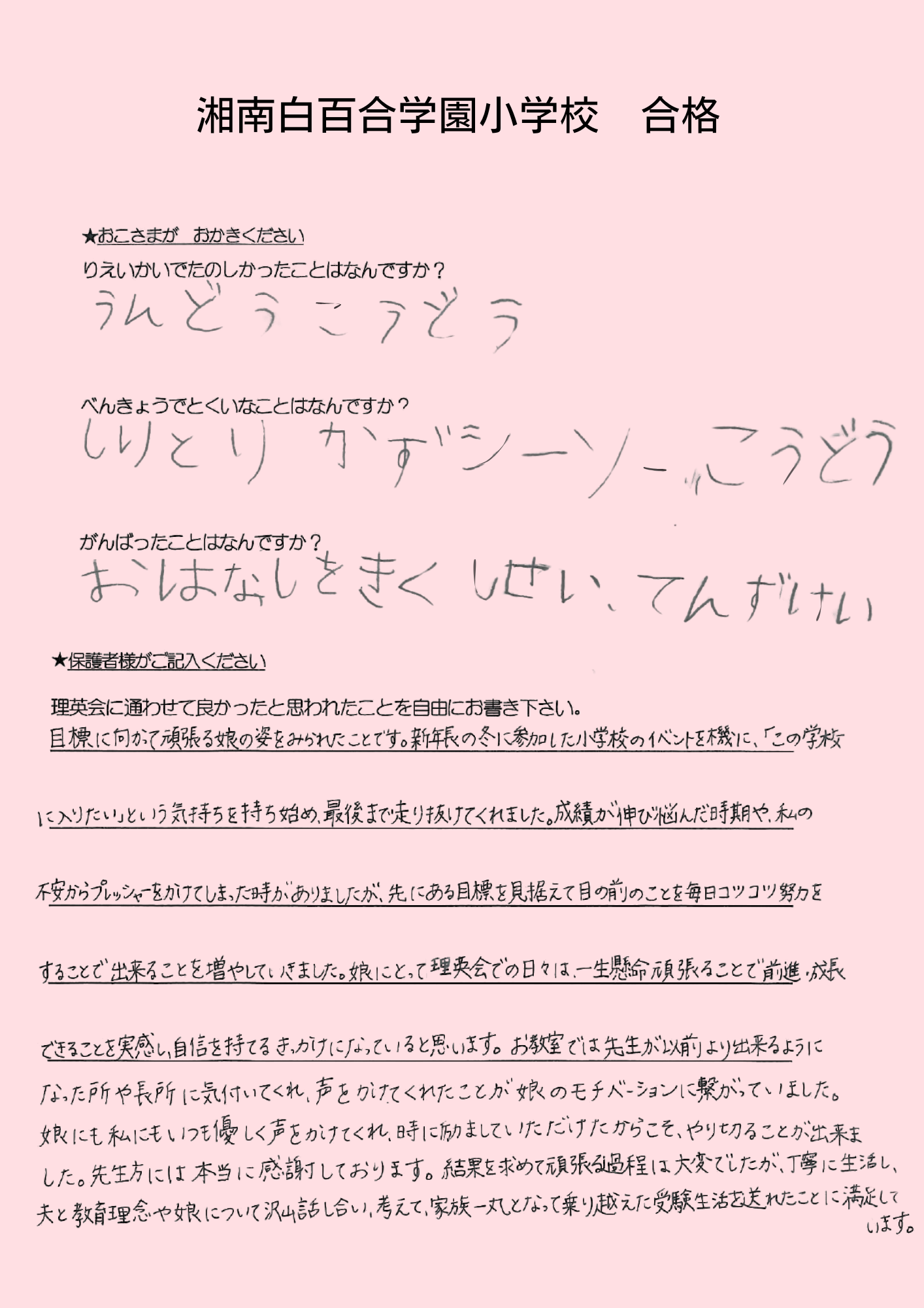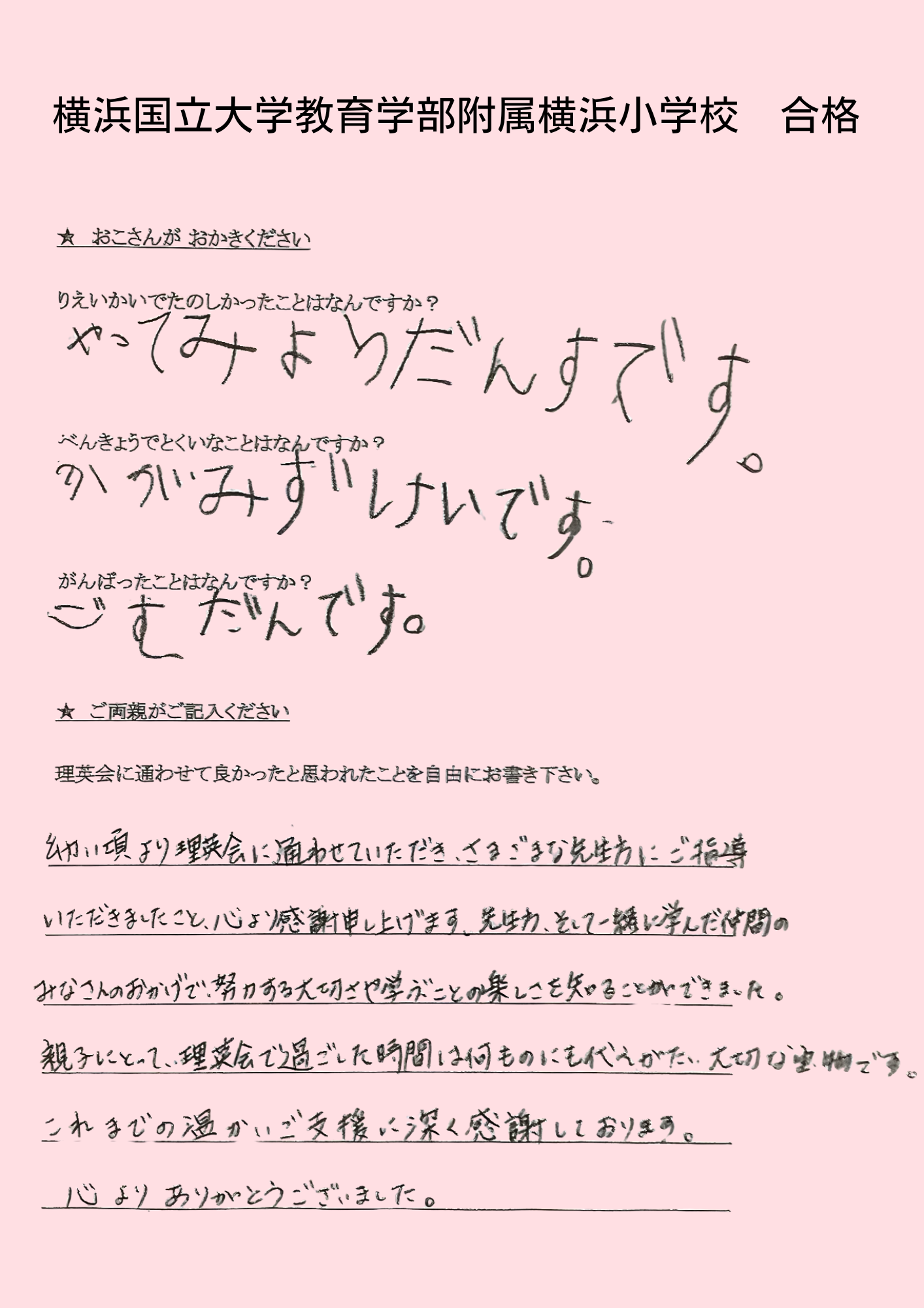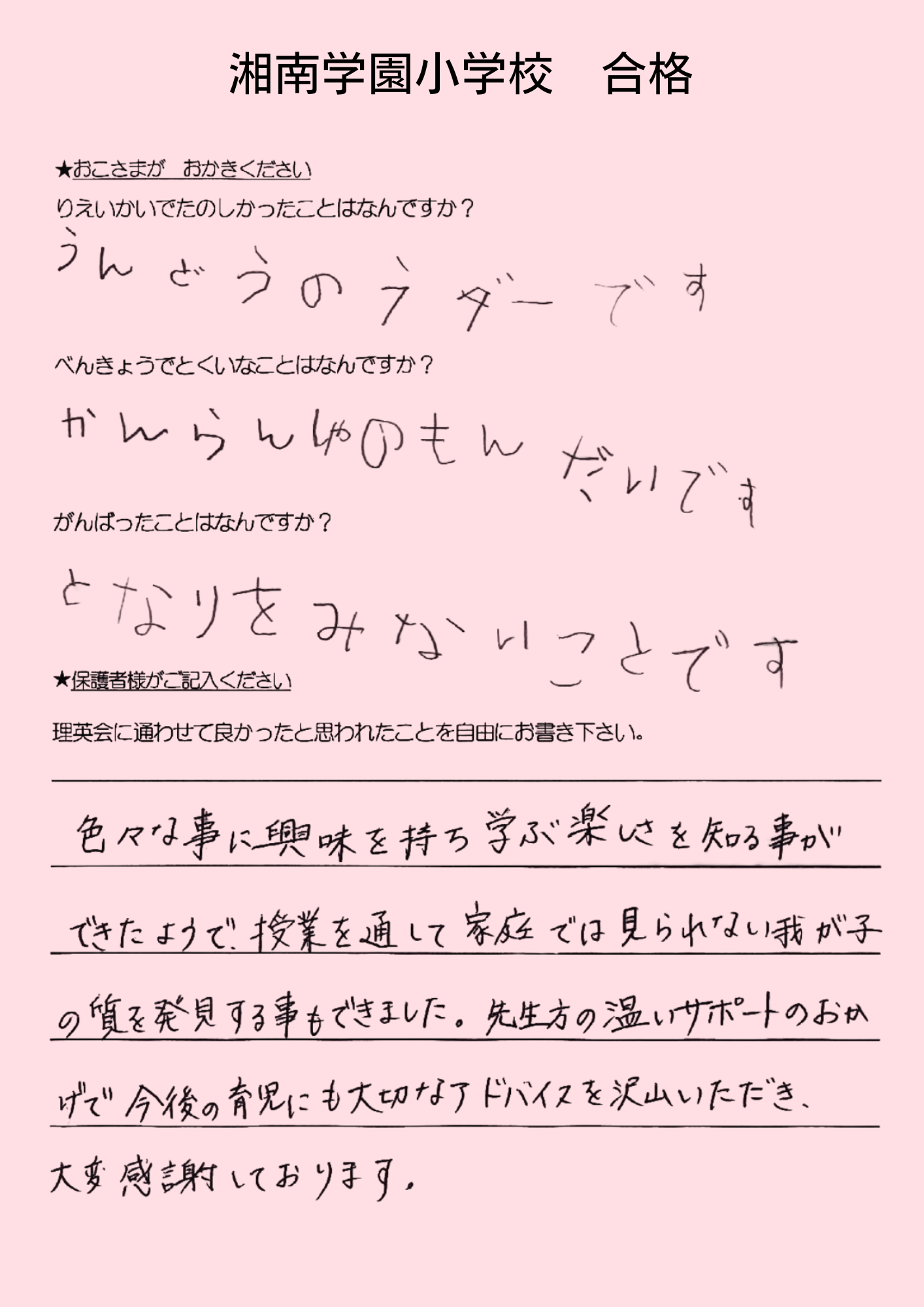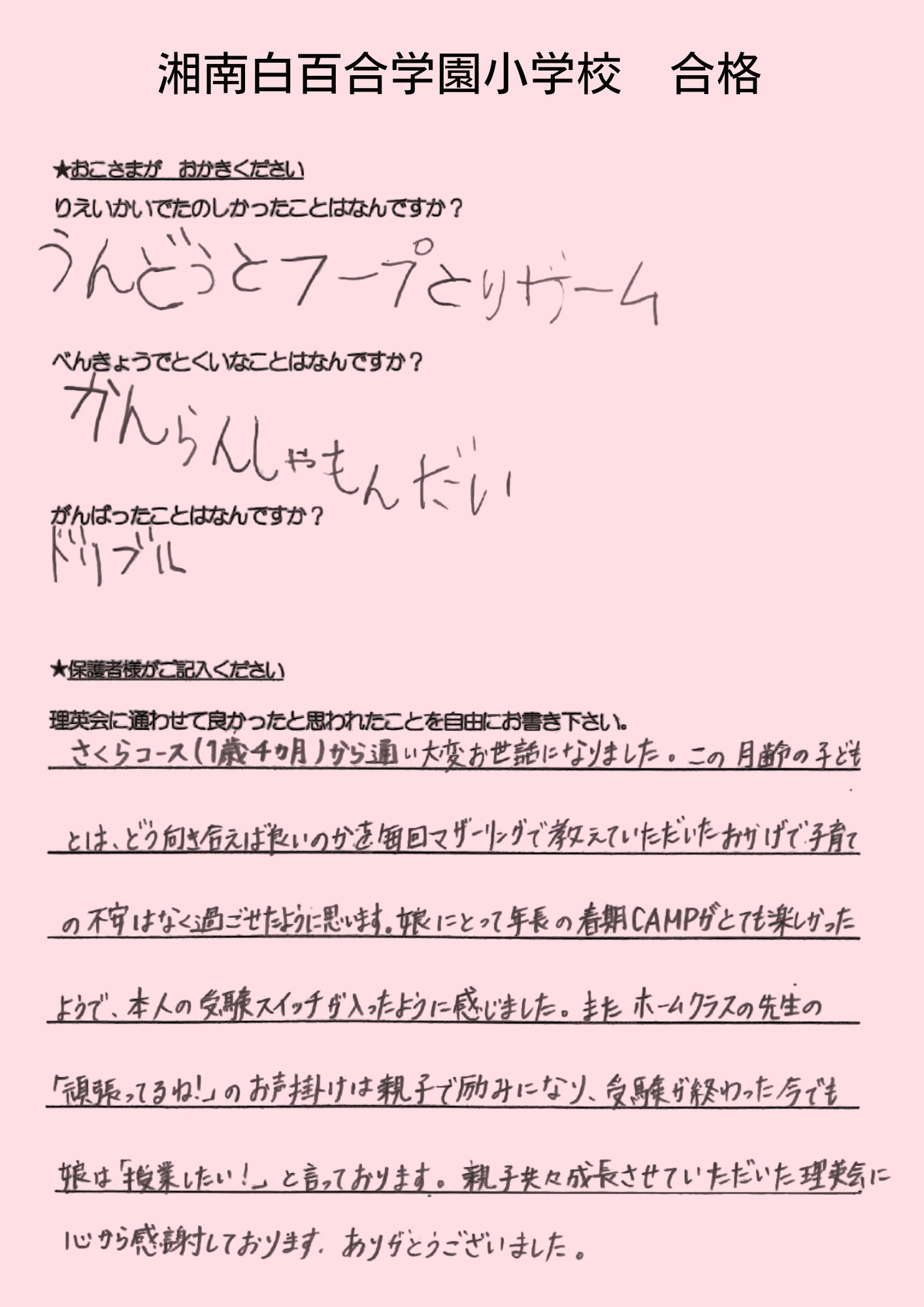 (息子より)合格してホッとした。本当に良かった。頑張ったから、合格出来て嬉しい。 えがえが先生ダイスキ!もう理英会に通えないのが悲しい。もっと理英会の教室に通いたい。 (母より)理英会は程よい緊張感と安心感をどちらも与えてくれる、私達親子にとってなくてはならない場所でした。先生方には本当に沢山の叱咤激励をしていただき、心から感謝申し上げます。理英会に通わせて本当に良かったと思います。有り難うございました。