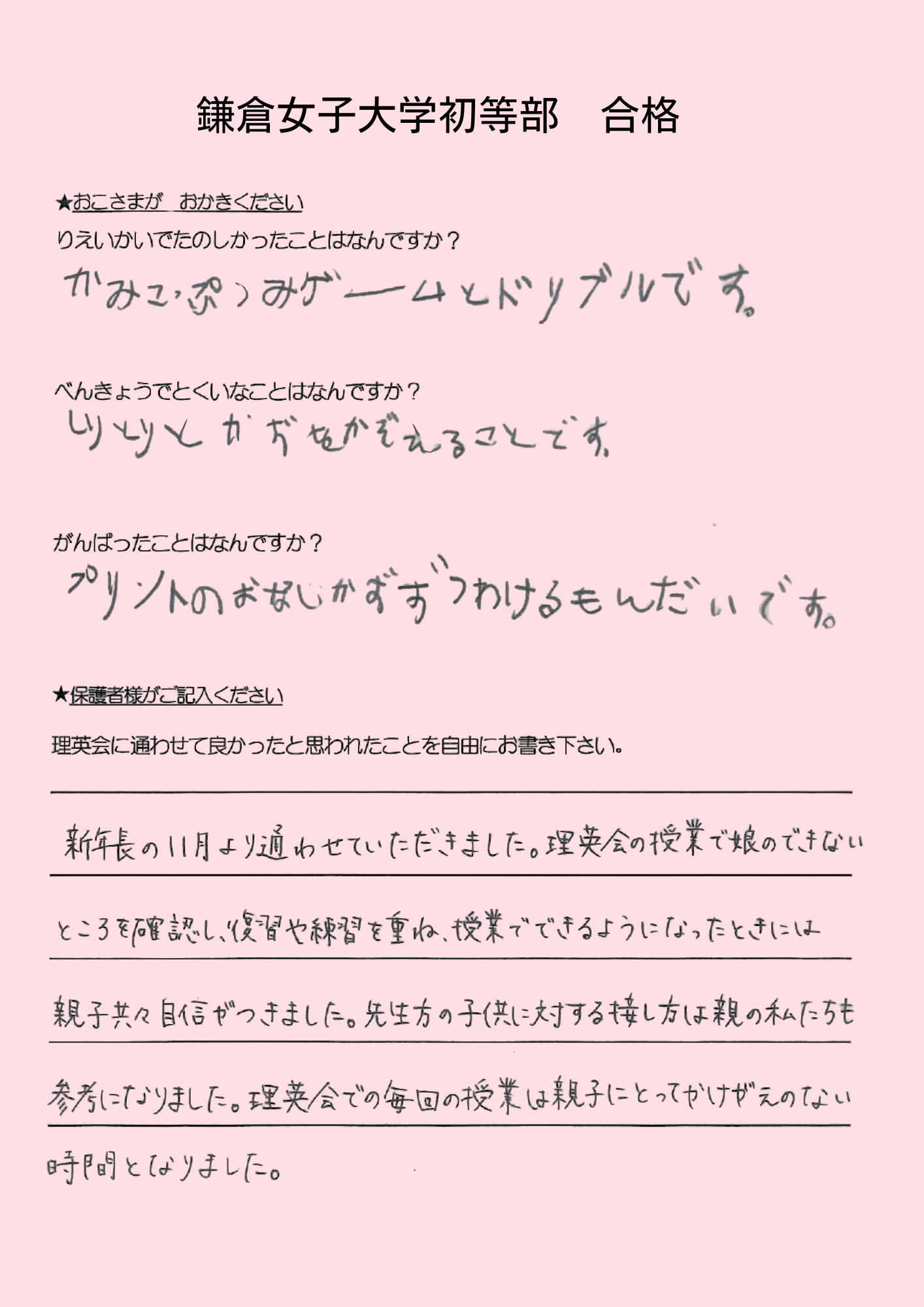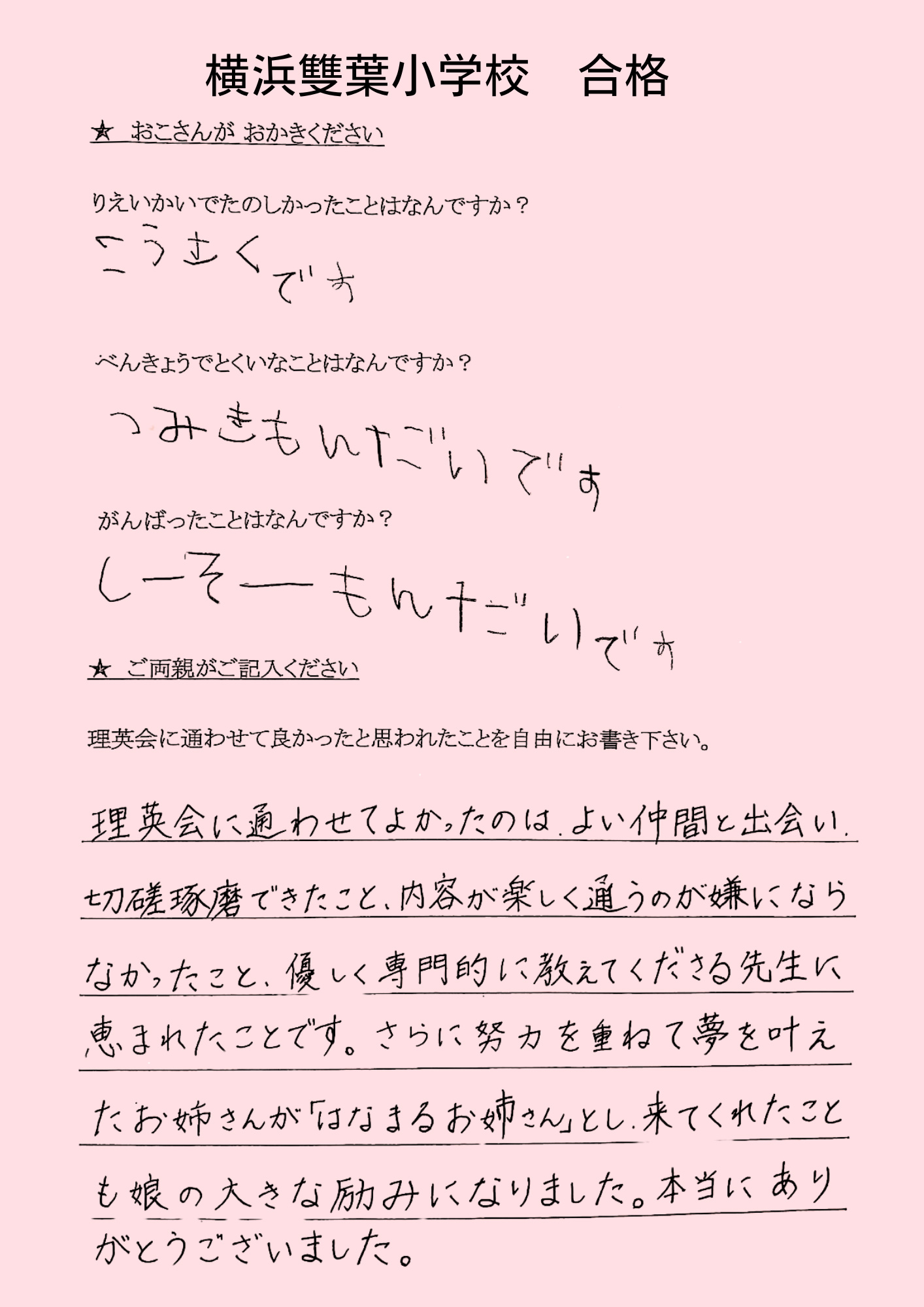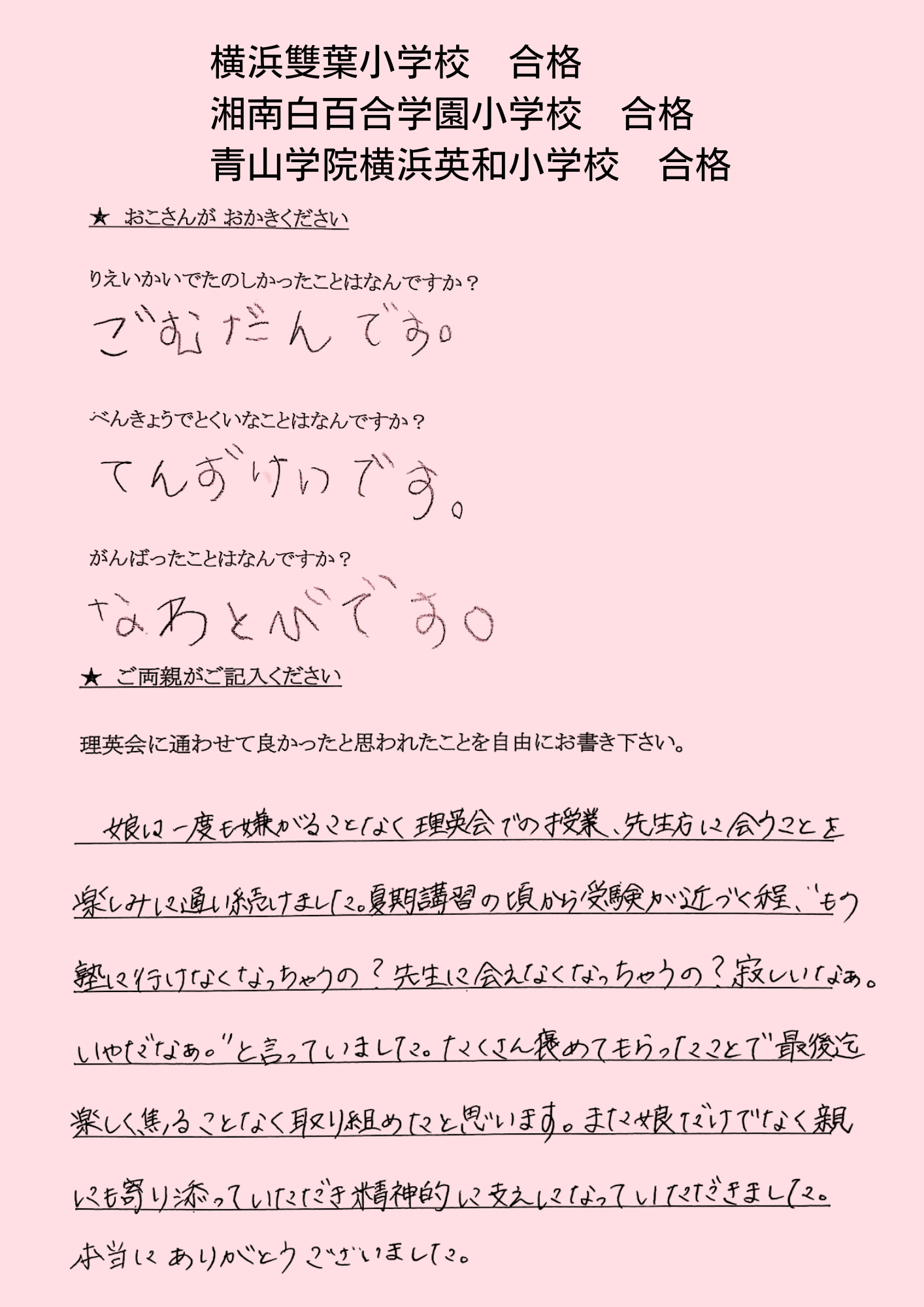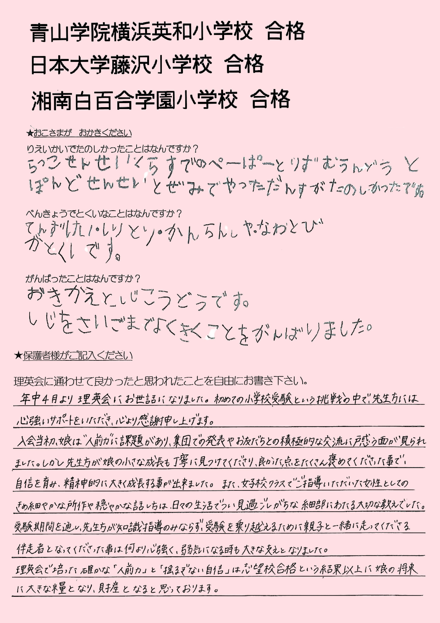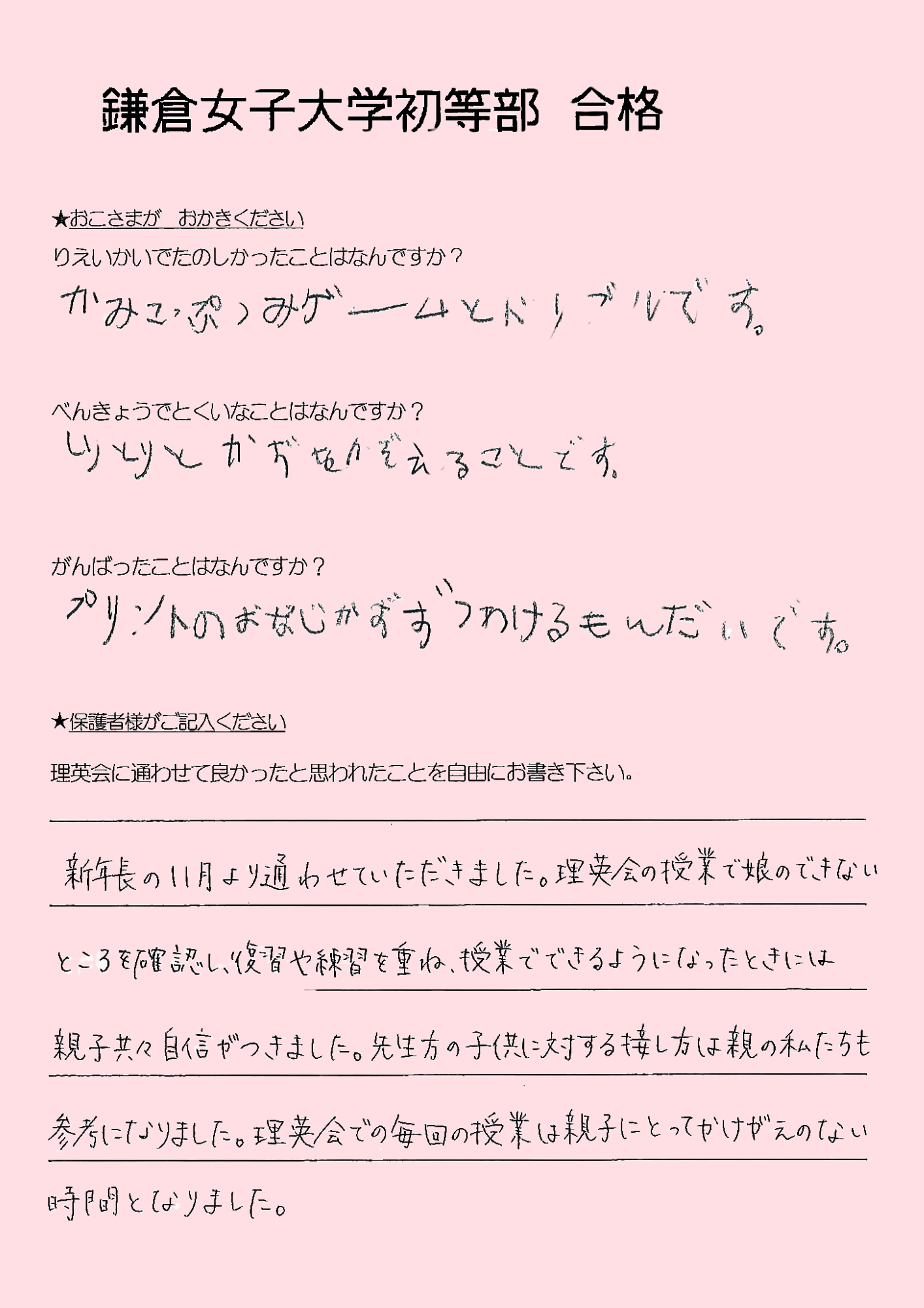 この度は、付属小の合格をいただくことができ、本当にありがとうございました。年中の秋に入会予定が入院することになってしまい、年長の夏に入会となりましたが、入院中も理英会の先生が励ましのお言葉をたくさん下さり、入会後も娘の体調や学力をよく見て下さいながら、細やかな授業、関わりをして下さいました。娘も私もどれだけのパワーをいただいたかわかりません。学力も娘を信じて最後まで関わり、励まし続けて下さいました。考査が終わった今でも、先生から教わったマナーや知識が生活の中で活きていると実感しております。本当にありがとうございました。