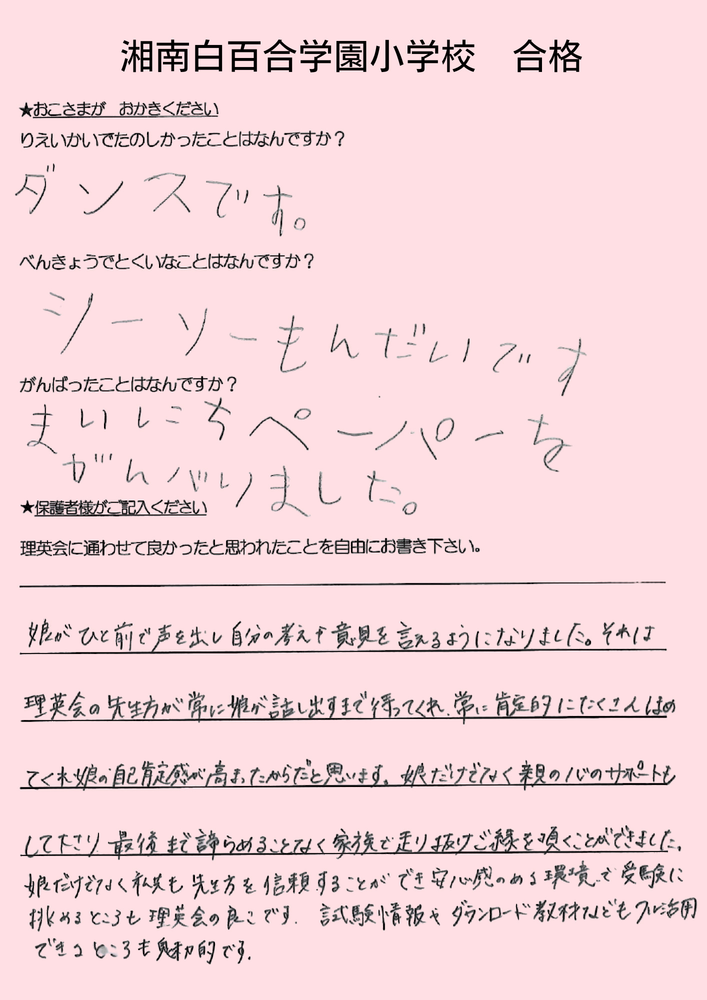 新年長からのスタートでしたが、合格をいただけたことは理英会の先生方の温かいご指導のおかげだと感謝しております。時に厳しく、できた時には思いっきり褒めていただき本人の自信にもつながりました。親子共々受験を通して学んだことを忘れずに過ごしていきたいと思います。