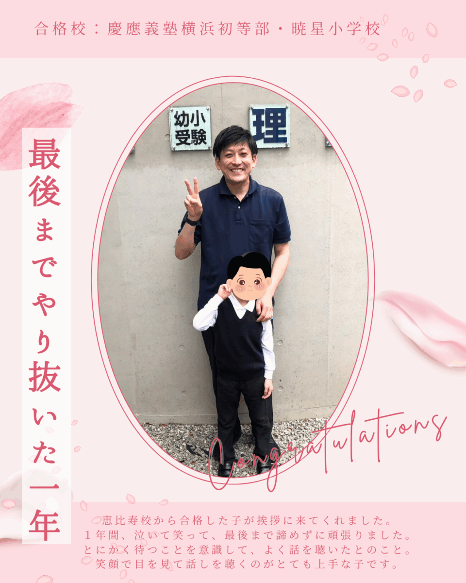 とにかく待つことを意識して、よく話を聴いたとのこと。笑顔で目を見て話しを聴くのがとても上手な子です。(合格校:慶應義塾横浜初等部・暁星小学校)