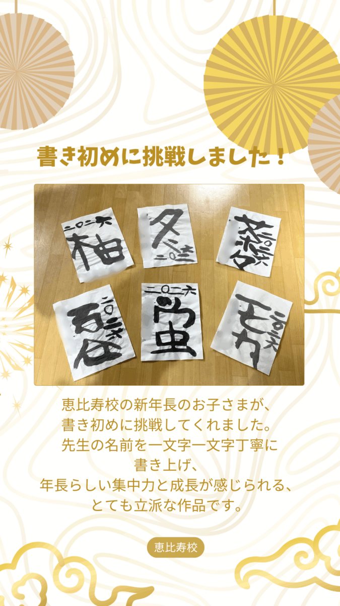 恵比寿校の新年長のお子さまが、書き初めに挑戦してくれました。先生の名前を一文字一文字丁寧に書き上げ、年長らしい集中力と成長が感じられる、とても立派な作品です。