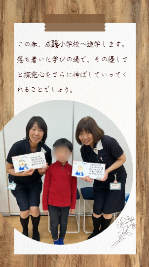 二人の先生に、ていねいに書いた手紙を渡してくれた男の子。素直な気持ちがあふれたその一枚には、普段からまっすぐに努力を重ねる姿がそのまま表れていました。この春、成蹊小学校へ進学します。落ち着いた学びの場で、その優しさと探究心をさらに伸ばしていってくれることでしょう。