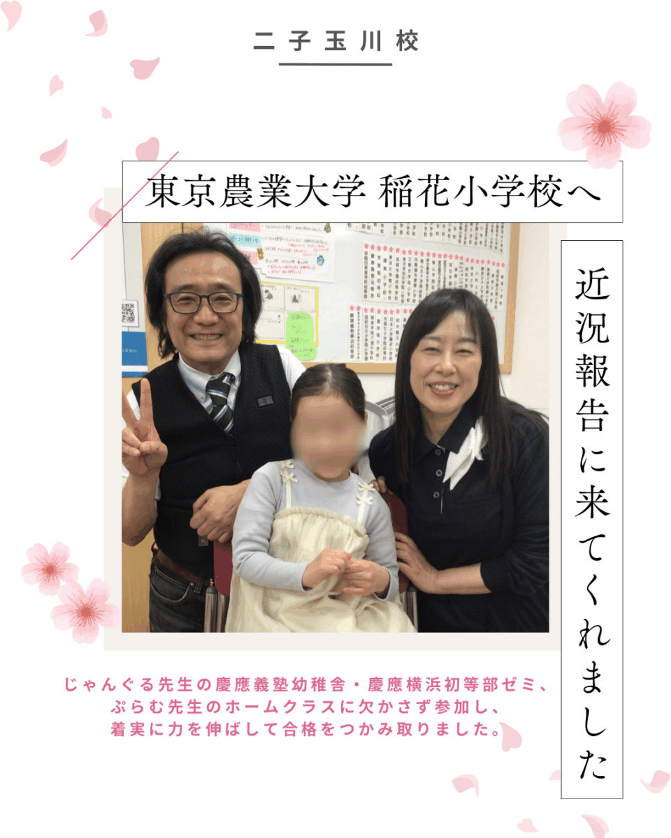 東京農業大学 稲花小学校へ進学した生徒が、近況報告に来てくれました。じゃんぐる先生の慶應義塾幼稚舎・慶應横浜初等部ゼミ、ぷらむ先生のホームクラスに欠かさず参加し、着実に力を伸ばして合格をつかみ取りました。