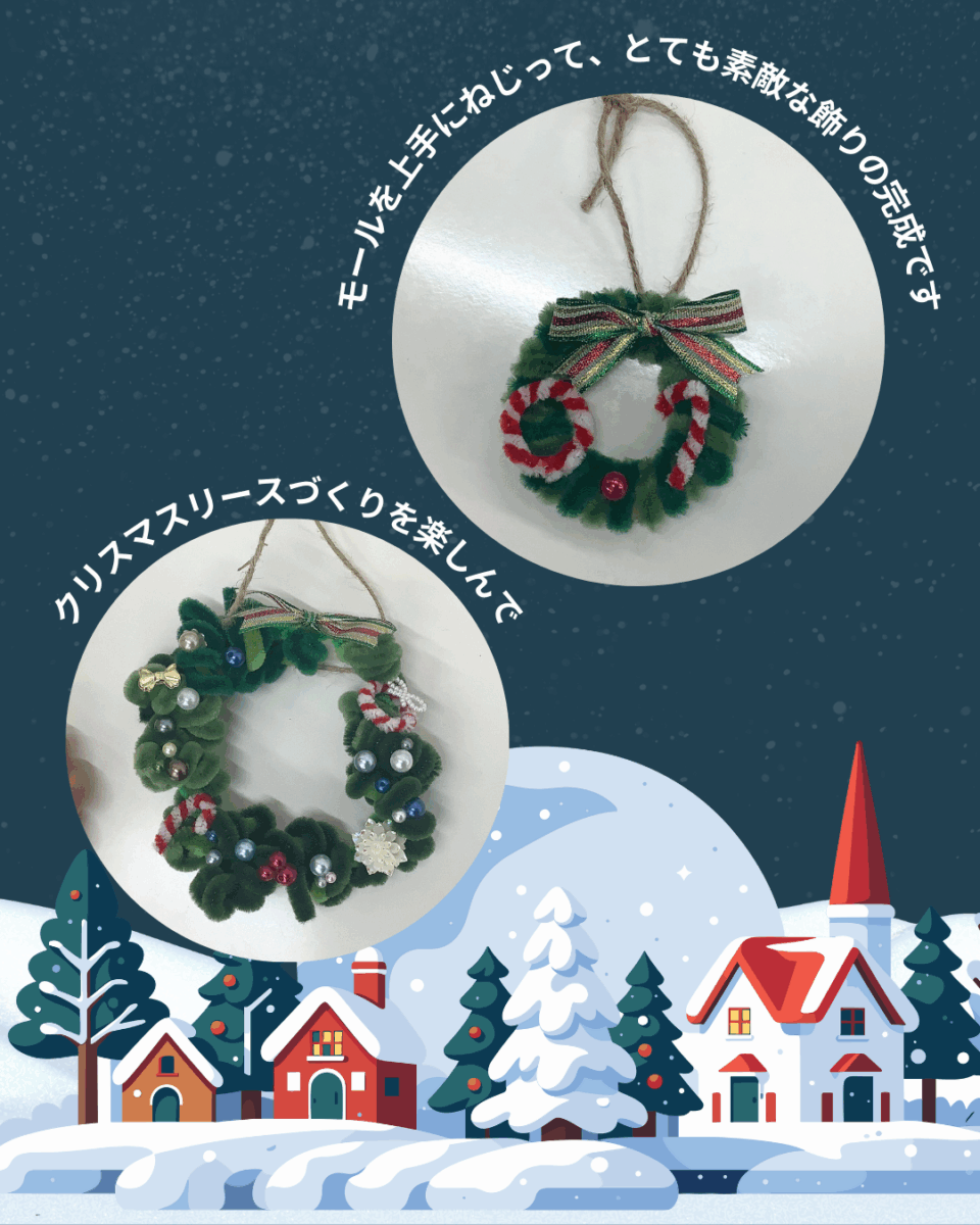 ジングルベル♪と街の中もこの時期の楽しい雰囲気にあふれています。理英会に通っているお友達も、クリスマスリースを作って持ってきてくれました。モールを上手にねじって、とても素敵な飾りの完成です。きっと「あの人」もこの飾りを見て喜んでくれるでしょう!
