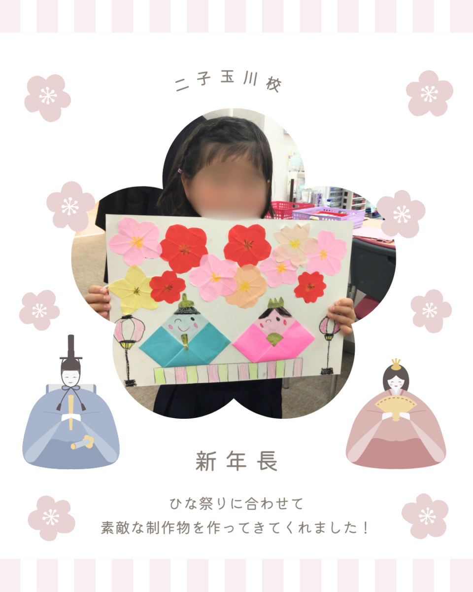 3月3日はひな祭りでした。新年長さんがひな祭りに合わせて素敵な制作物を作ってきてくれました。折り紙で花を表現してくれてますが、よく見ると形が少しずつ違っていたりして、細かな作業が光ります。ひな人形を飾って祝うのもいいですが、作品を飾ってお祝いも良いですね!