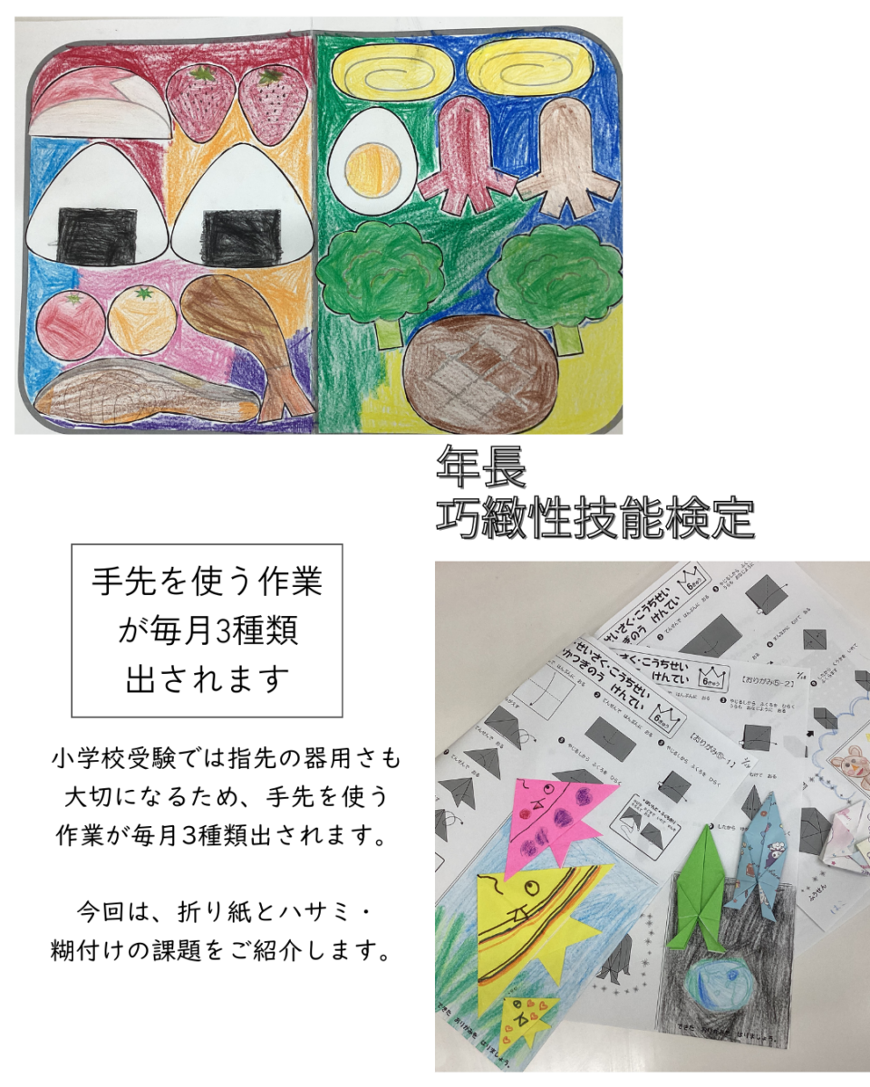 今回は、折り紙とハサミ・糊付けの課題をご紹介します。