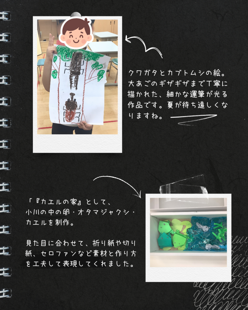 折り紙を折ったり、綺麗な紙をオタマジャクシの形に切ってみたり、カエルの卵をセロファンに表現したり、