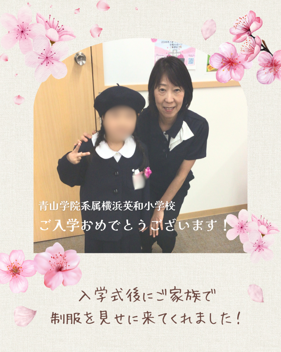青山学院系属横浜英和小学校に入学、入学式後にご家族で制服を見せに来てくれました。真新しい制服に身を包んだ姿に、講師一同笑顔になりました。充実した学校生活が待っています!二子玉川校から変わらず応援してますよ。