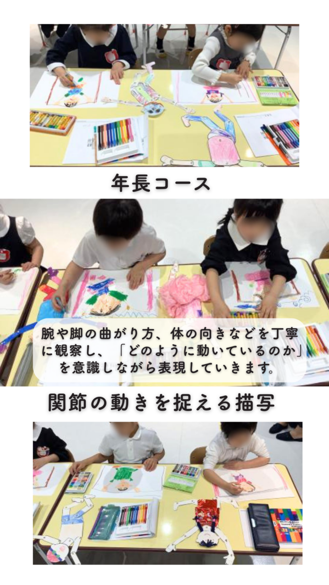 腕や脚の曲がり方、体の向きなどを丁寧に観察し、「どのように動いているのか」を意識しながら表現していきます。