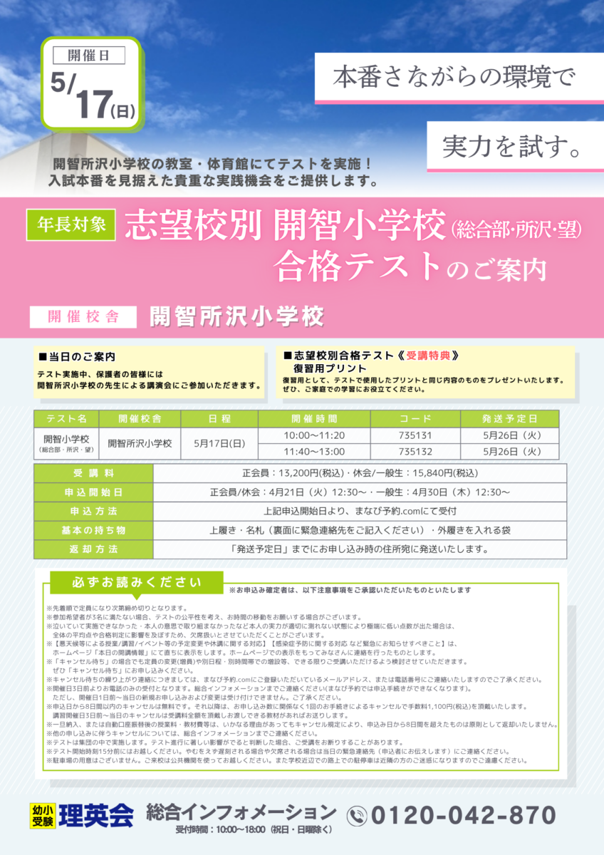 [年長対象]志望校別 開智小学校(総合部・所沢・望) 合格テストのご案内