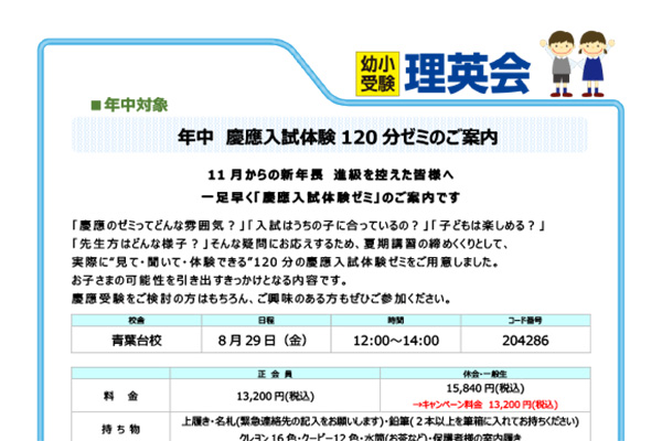 授業の他、専門スタッフによる小学校受験や教室について、最新情報のご提供や、理英会の教育についてもご説明いたします。